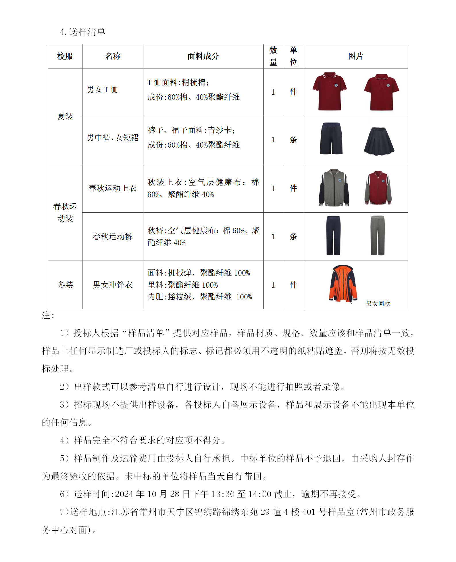 4.采購需求:常州市新北區飛龍實(shí)驗小學(xué)校服采購項目,項目?jì)热莅7脑O計、制作、運輸、裝卸、至采購人現場(chǎng)指定位置,通過(guò)相關(guān)檢驗檢測并經(jīng)采購人及其相關(guān)部門(mén)的驗收,直至發(fā)放和余貨取回等全過(guò)程工作。采購人實(shí)際采購可能只從各品目中選擇一種或多種(不一定全套均采購),中標單位需等到采購人新生報到,征得2/3以上家長(cháng)同意后,雙方才履行合同,采購人負責將采購款式、數量交予中標單位,中標單位按照采購人提供的款式、顏色要求制造校服,校服面料必須與采購需求中一致。貧困學(xué)生校服征訂工作按教育主管部門(mén)相關(guān)文件執行。中標單位還需要承擔其他班級校服的增訂工作,具體數量?jì)r(jià)格按照現有標準實(shí)行。