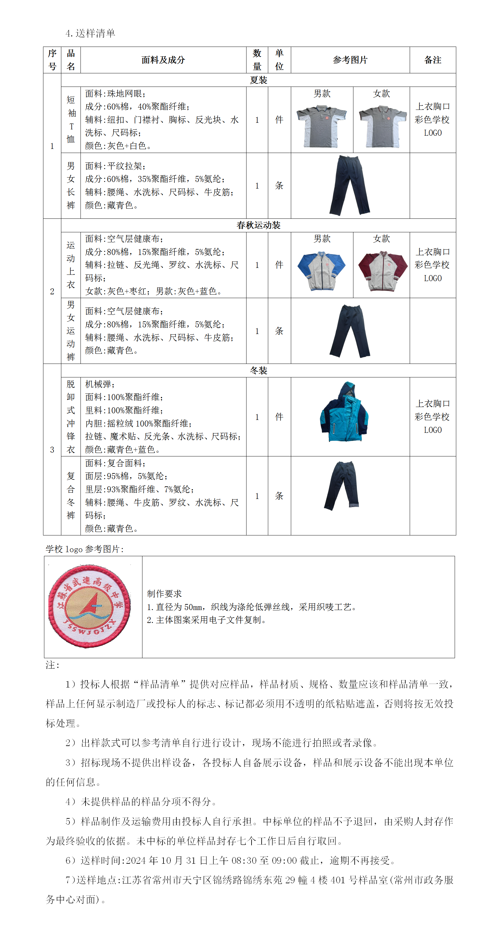 4.采購需求:江蘇省武進(jìn)高級中學(xué)學(xué)生校服采購項目,項目?jì)热莅7脑O計、制作、運輸、裝卸、至采購人現場(chǎng)指定位置,通過(guò)相關(guān)檢驗檢測并經(jīng)采購人及其相關(guān)部門(mén)的驗收,直至發(fā)放和余貨取回等全過(guò)程工作。采購人實(shí)際采購可能只從各品目中選擇一種或多種(不一定全套均采購),中標單位需等到采購人新生報到,征得2/3以上家長(cháng)同意后,雙方才履行合同,采購人負責將采購款式、數量交予中標單位,中標單位按照采購人提供的款式、顏色要求制造校服,校服面料必須與采購需求中一致。學(xué)校要結合實(shí)際加大對家庭經(jīng)濟困難學(xué)生、革命烈士子女、孤兒、殘疾兒童以及其他特殊家庭學(xué)生等的校服保障力度,采取多種措施減免校服費或無(wú)償提供校服。中標單位還需要承擔其他班級校服的增訂工作,具體數量?jì)r(jià)格按照現有標準實(shí)行。具體內容如下: